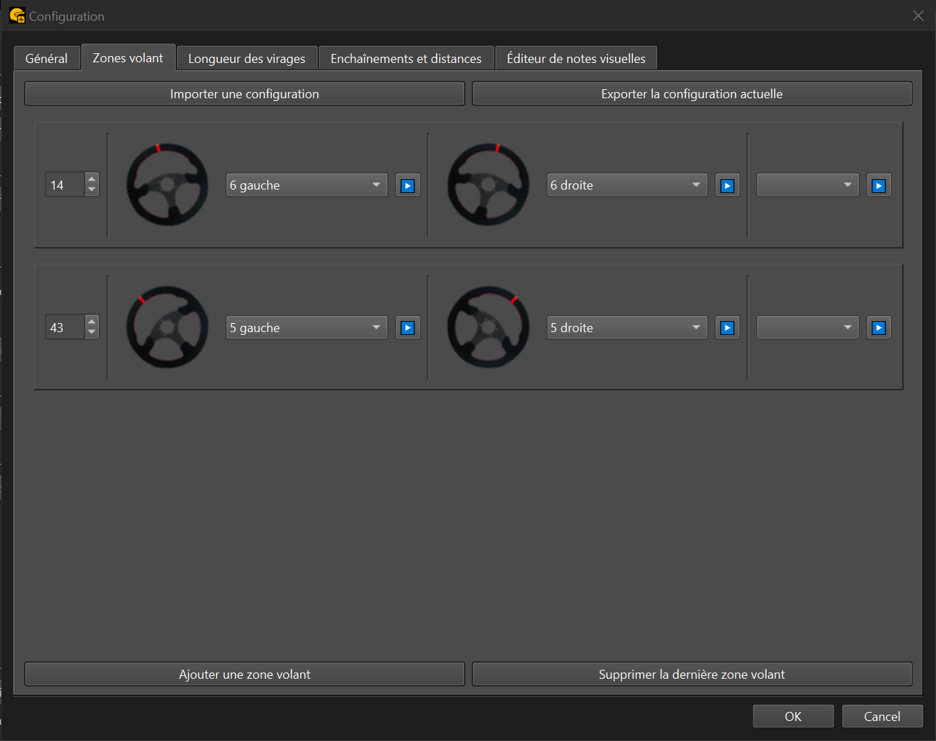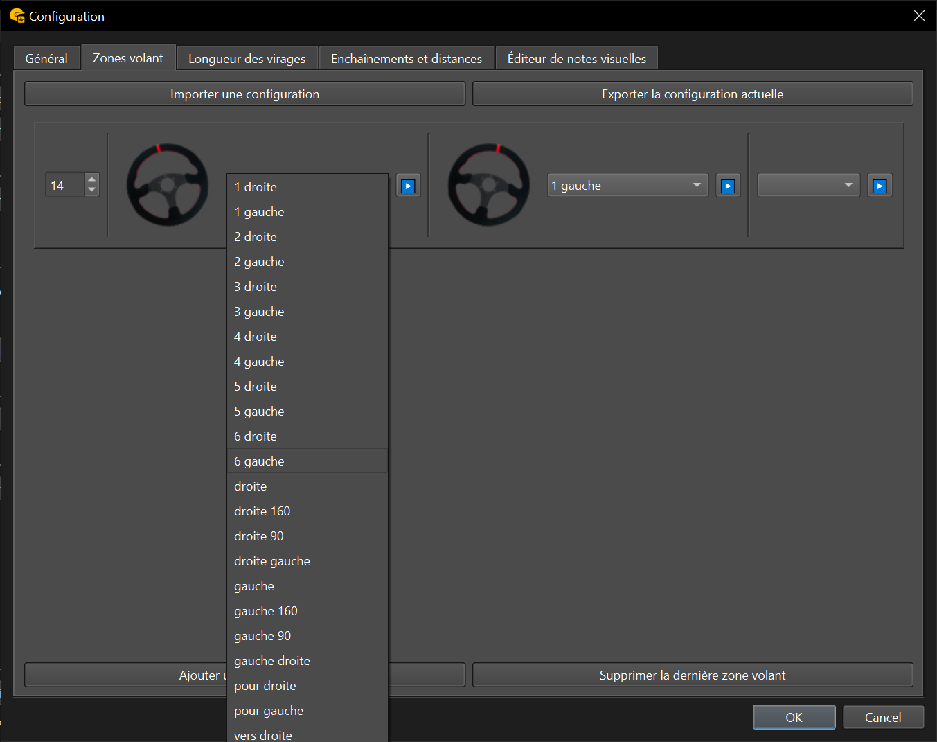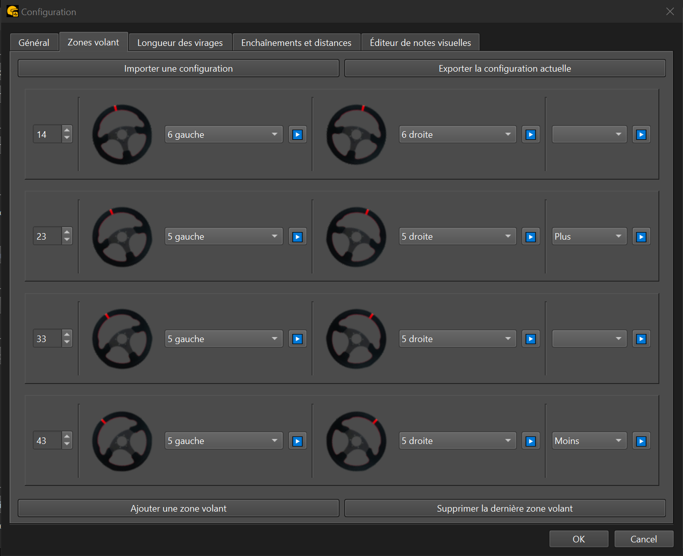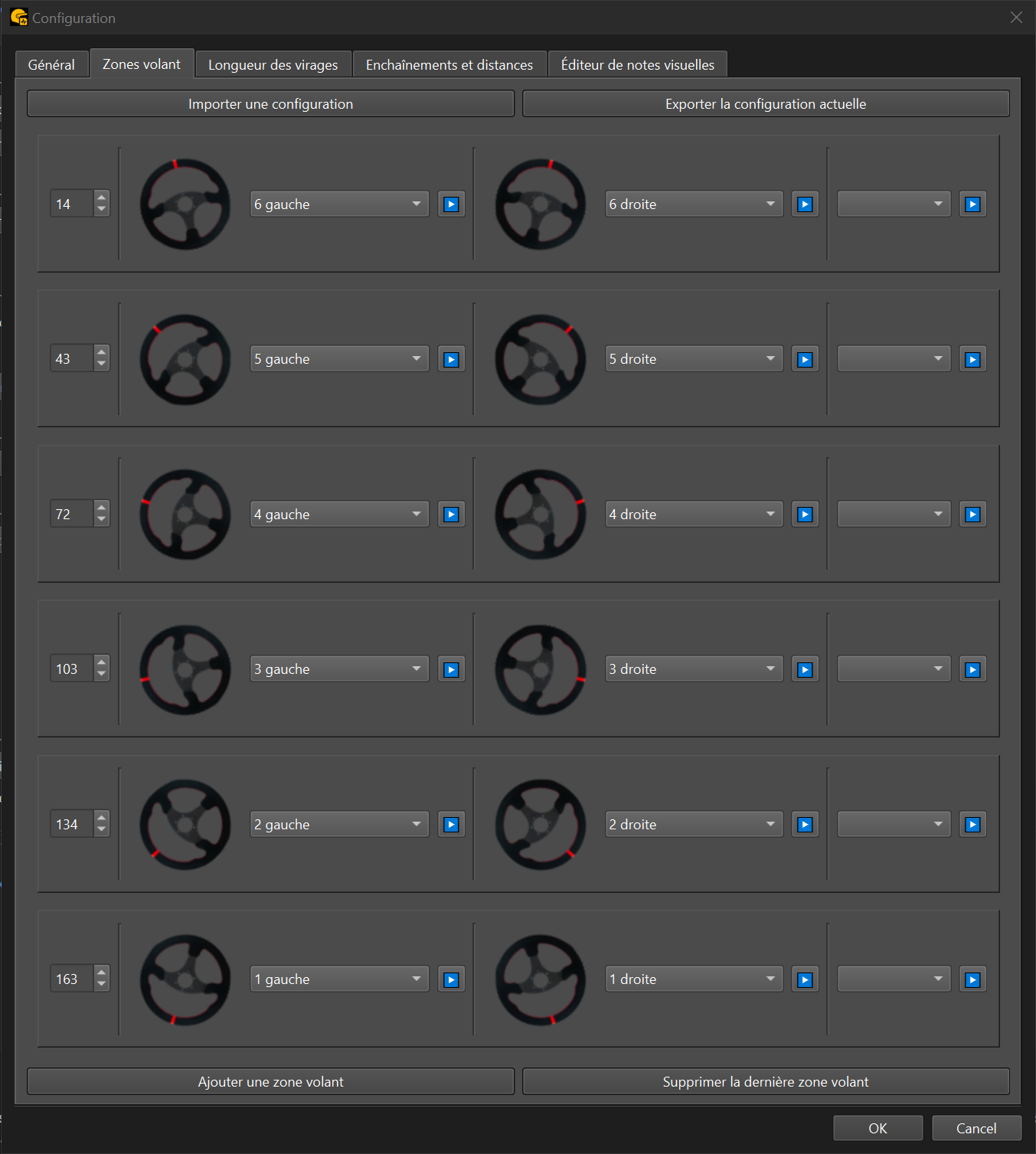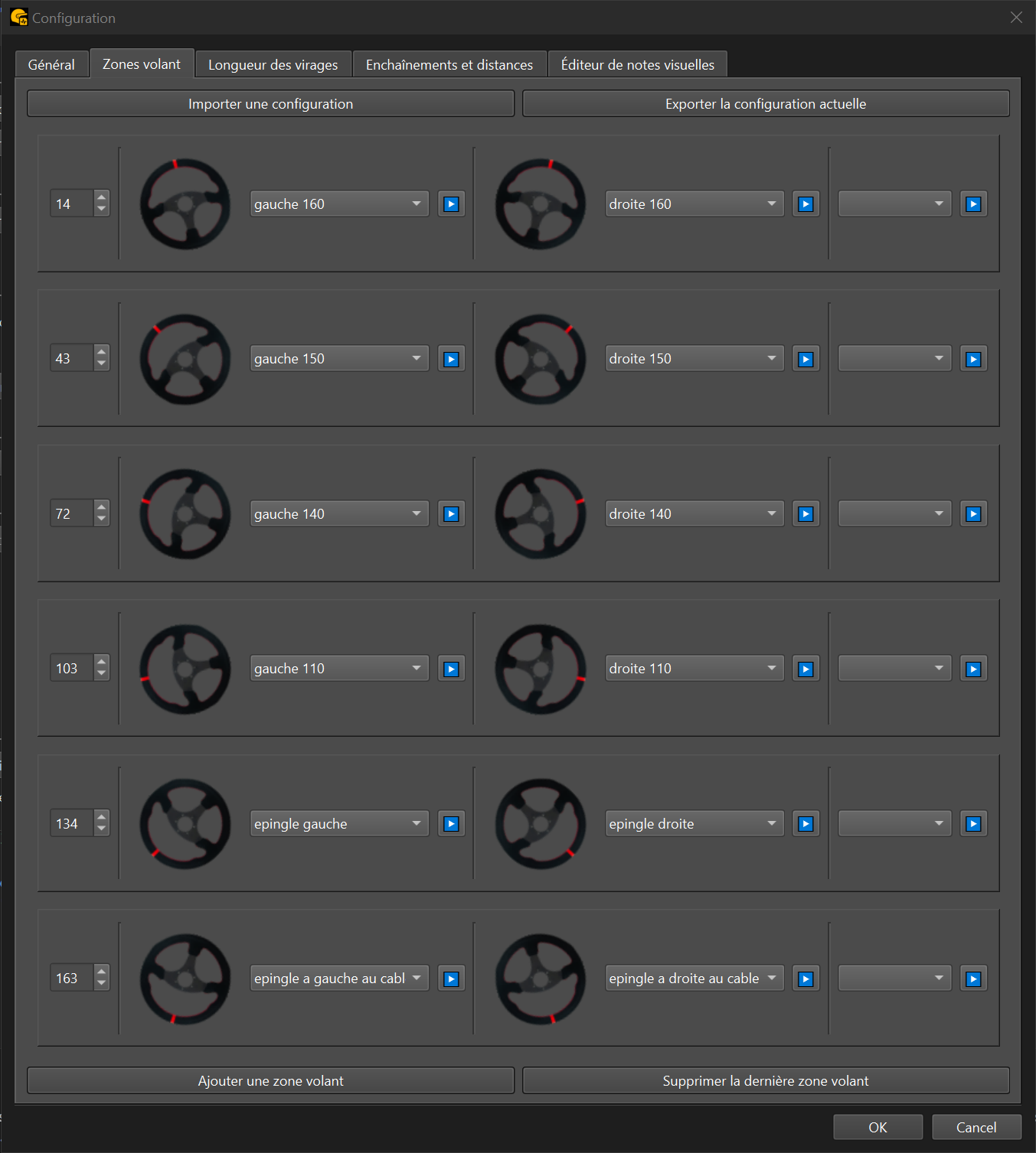 Les zones volant permettent de catégoriser les virages selon l’angle appliqué au volant. Lorsque vous passez un virage, le système enregistre l’angle de rotation du volant maximal et déclenche l’appel correspondant à la plage définie.